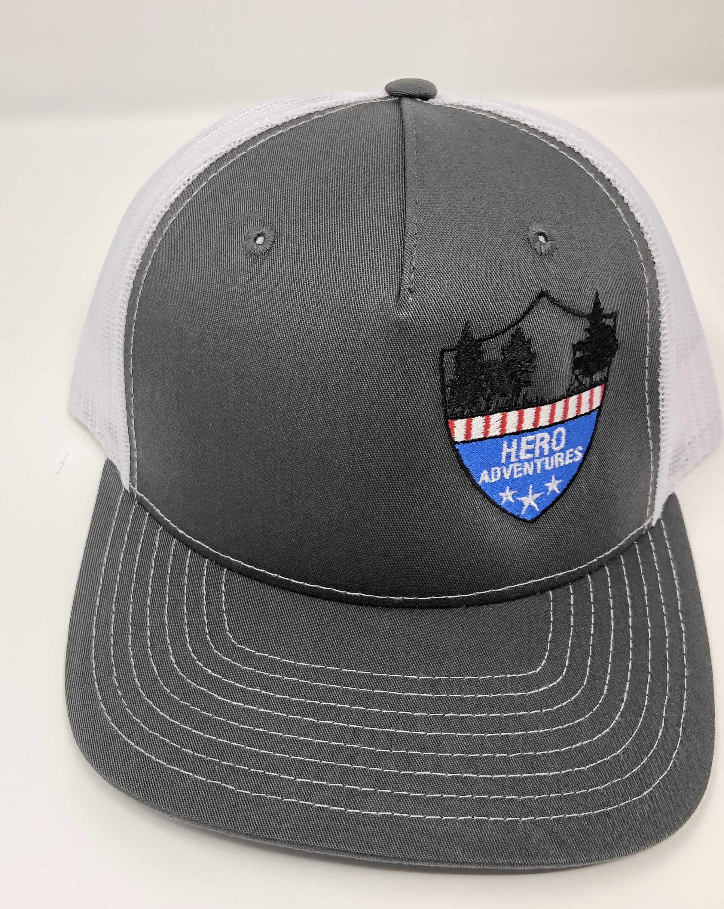 One size fits most – Richardson 35/65 Cotton/Polyester, 100% polyester mesh back, Pre-curved contrast stitched visor, adjustable plastic snapback